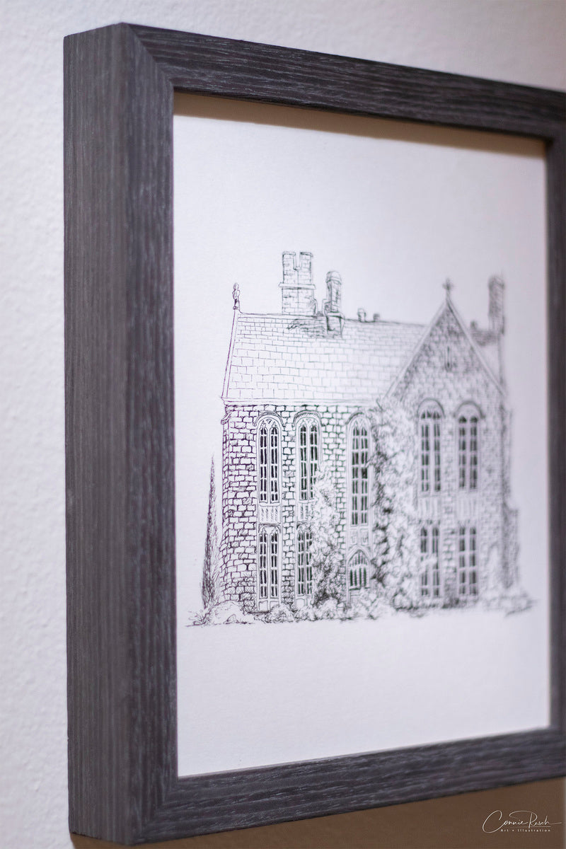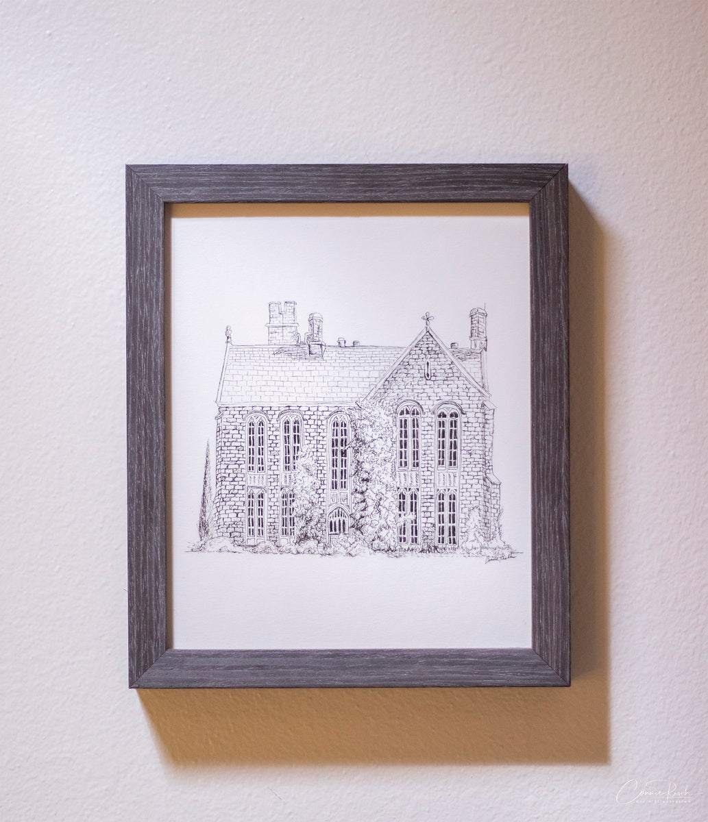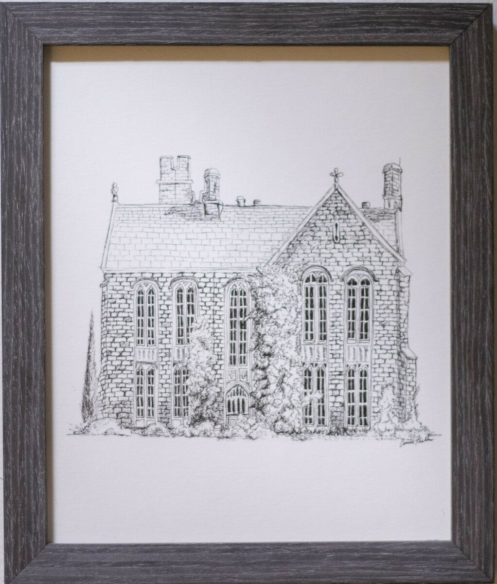 This vintage inspired ink illustration features Gresgarth Hall Garden in Lancaster. Original framed piece is signed by the artist and includes a certificate of authenticity, as well as UV resistant plexi-glass (Acrylite OP3) to protect the art over a lifetime. Original is a 8x10” piece on paper in a grey stained 9”x11” wood frame.