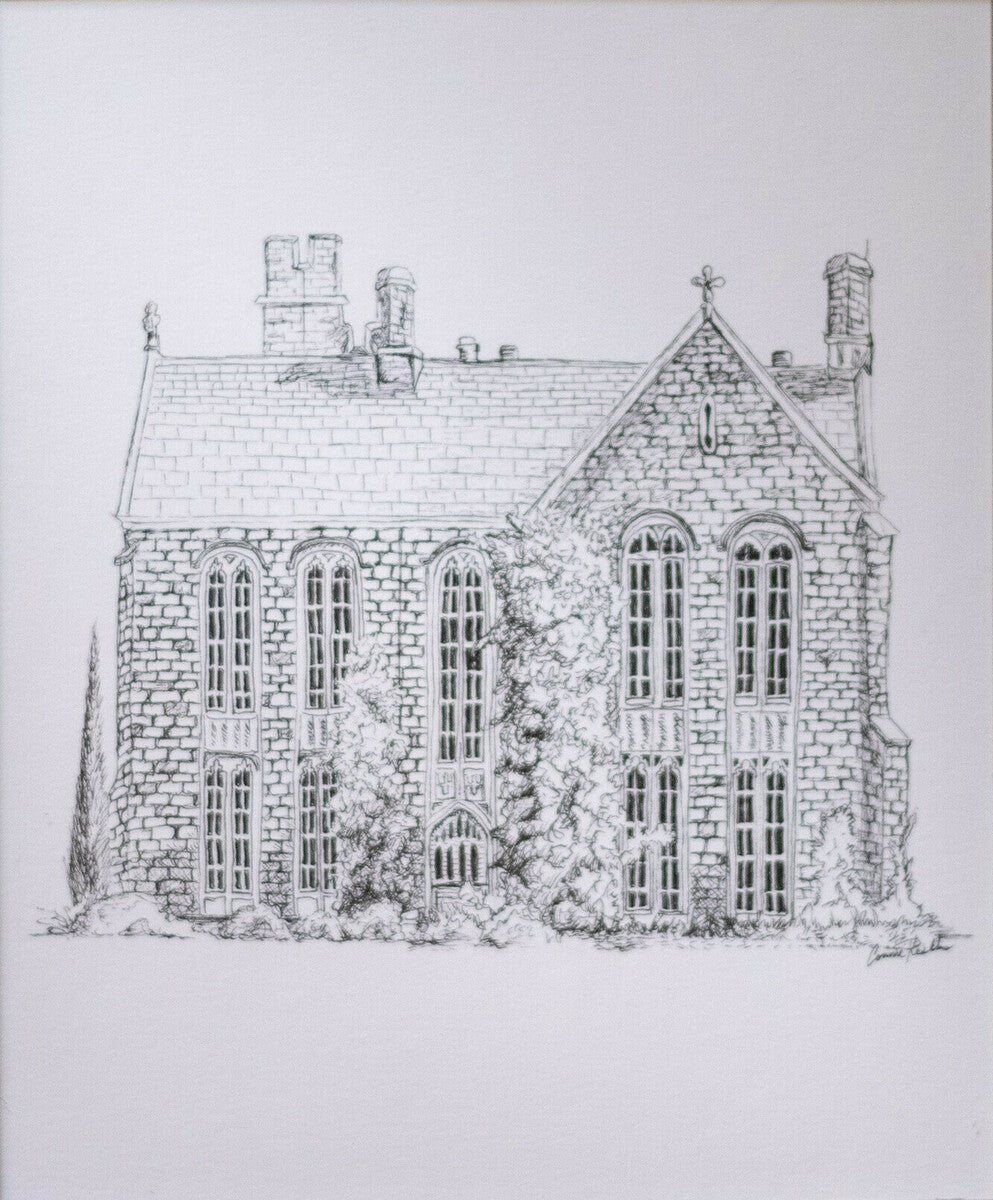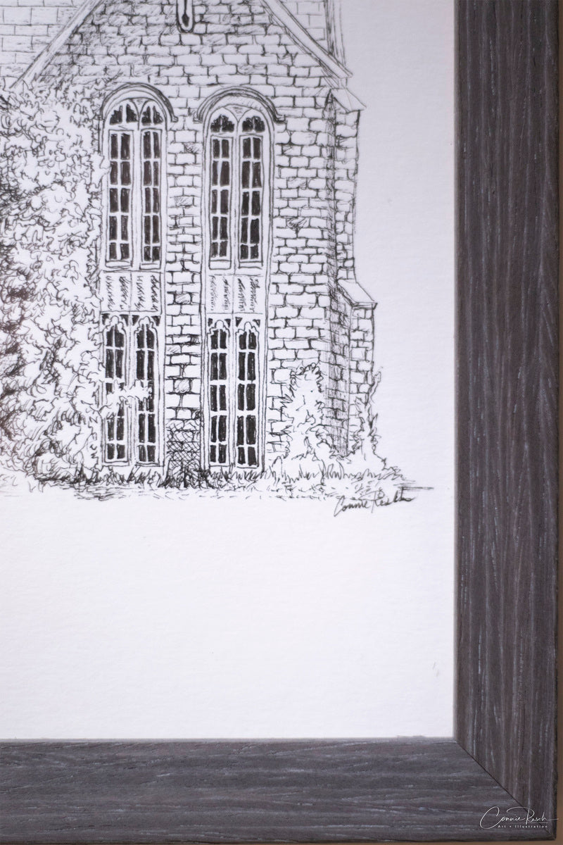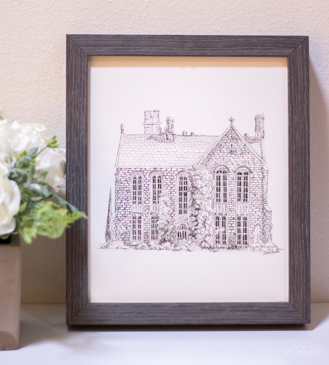 This vintage inspired ink illustration features Gresgarth Hall Garden in Lancaster. Original framed piece is signed by the artist and includes a certificate of authenticity, as well as UV resistant plexi-glass (Acrylite OP3) to protect the art over a lifetime. Original is a 8x10” piece on paper in a grey stained 9”x11” wood frame.