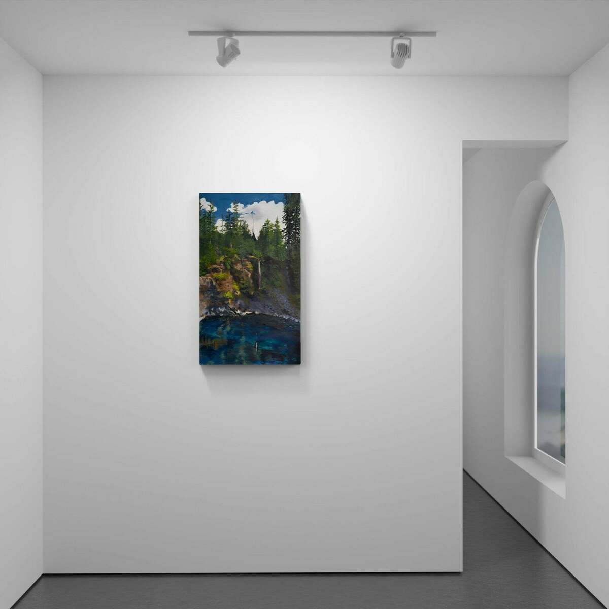 Painting in oil on canvas depicting a forested cliff above a crystal blue lake.