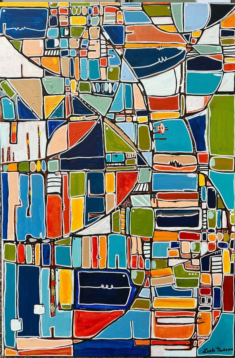 Leah Nadeau is a Seattle-based contemporary abstract artist known for her use of geometric compositions, bold color stories, and signature linework. Nadeau’s aesthetic is defined by vibrant color blocking and energetic lines. She creates a unique rhythm between chroma and contrast as she paints, lending every painting an immediate sense of vitality. Her skills for discernment and visual memory have become finely tuned through years of travel, sketching, painting, and ideating, all of which became the foundations for her art career. She began incorporating industry, architecture, and design into her work as commentary on the societal imagery we consume both consciously and unconsciously. Her post-graduate education in film strengthened her ability to view the world from the outside in. Nadeau’s art is heavily influenced by the German Expressionist Movement in cinema, Rondocubism, and Gothic-style architecture. Her innovative techniques capture the frenetic feel of cityscapes in time gone by, the stasis of aerial landscapes over Europe and the United States, and the essence of the Mid-Century Modern Era.