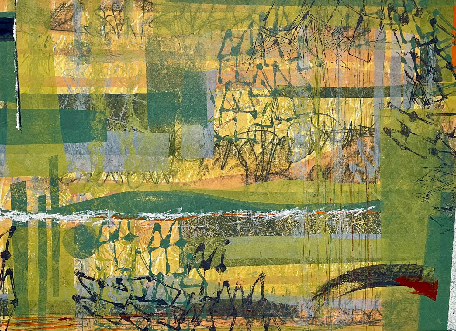 I apply ink to a Plexiglas plate, using unusual tools and handmade stencils, layering shapes and colors until I achieve the image that I want. I use a high quality BFK paper for my prints.