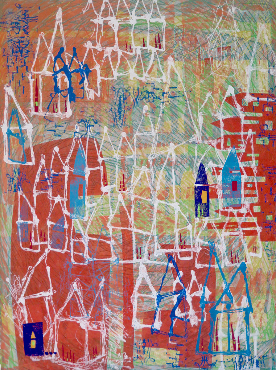 I apply ink to a Plexiglas plate, using unusual tools and handmade stencils, layering shapes and colors until I achieve the image that I want. I use a high quality BFK paper for my prints.