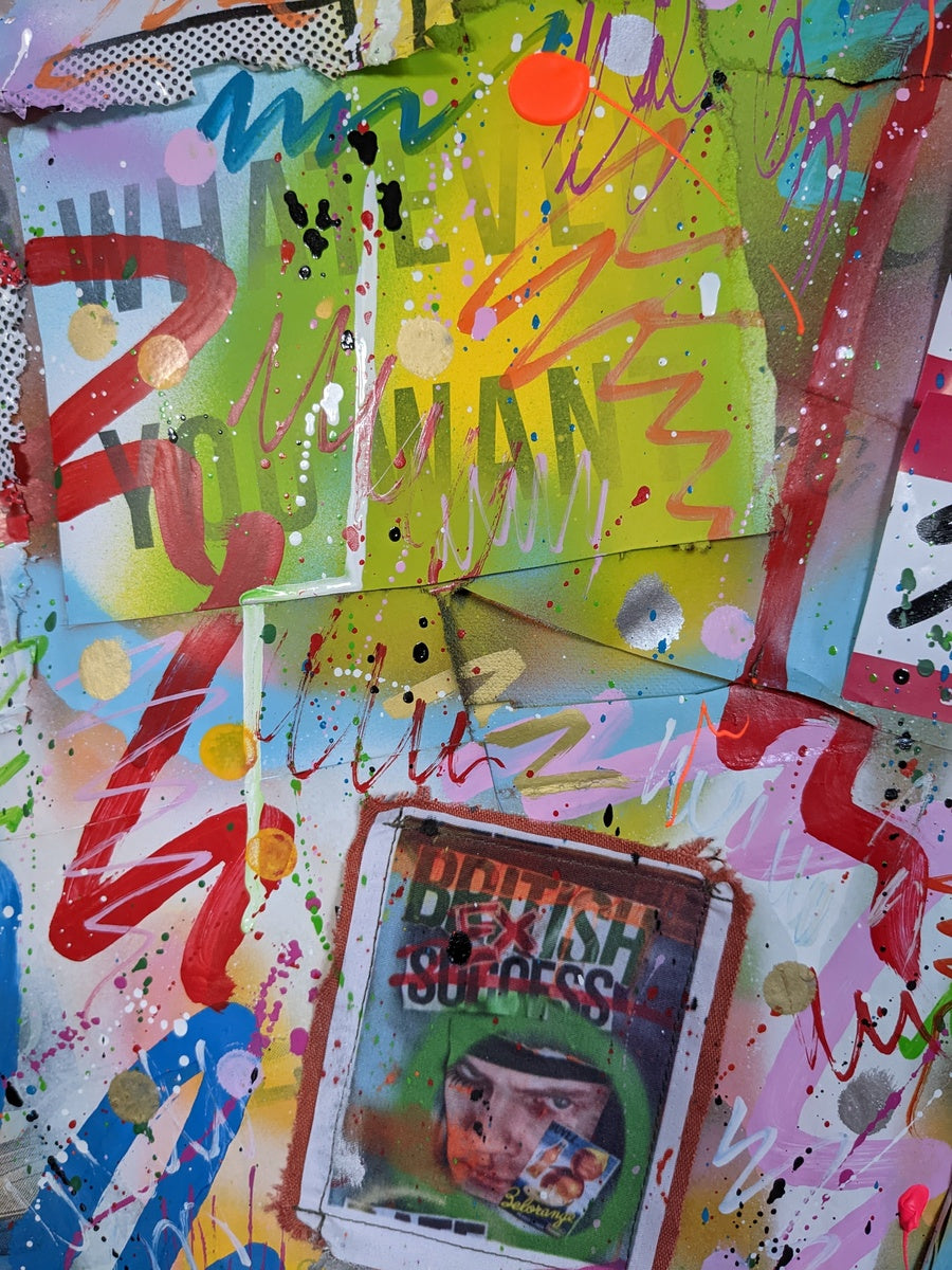My work is inspired by a number of different factors – found pieces from magazines and cuttings, graffiti, pop art, pop culture, bold colours, plays on words and advertising.