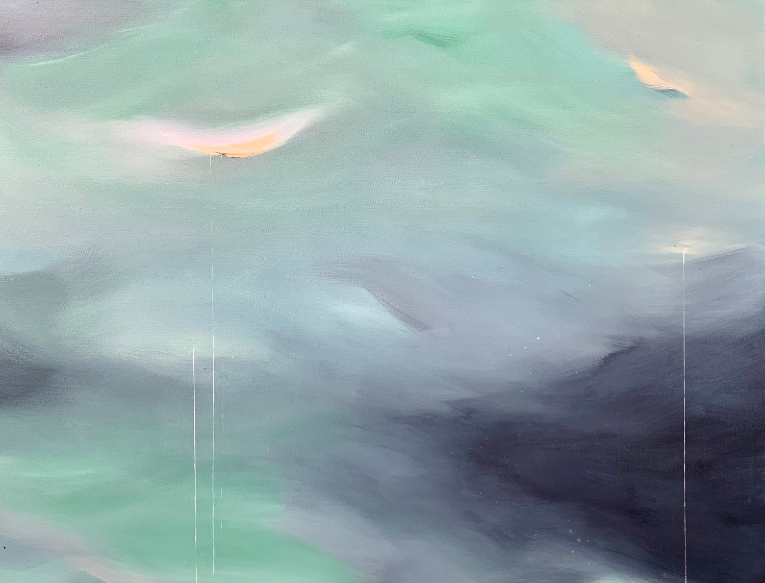 My paintings begin intuitively, with a few tones inspired by the world around me and mixed directly on the canvas. I move pigment, explore and experiment with tactile textures or fluid splatters, adding and subtracting as a conversation unfolds between the piece and myself. A contemplative dialog of exploration and curiosity. The results are immersive mood pieces that contain moments of calm and space for reflection. I hope that the viewer feels the invitation to pause, to explore the artwork and delight in discovery, to breathe in the moment.