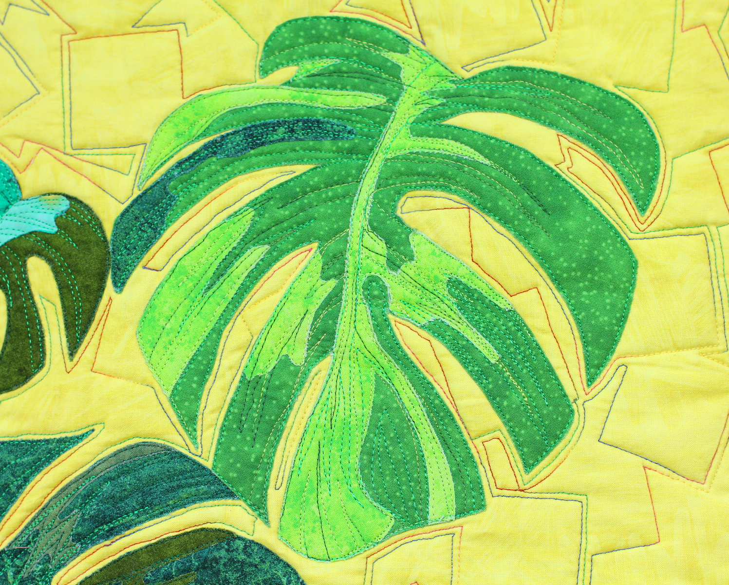 Three leaves on a lime background. Raw-edge appliqué, thread-painting and quilting techniques used on 100% quilter's cotton. Mounted on canvas stretching bars.