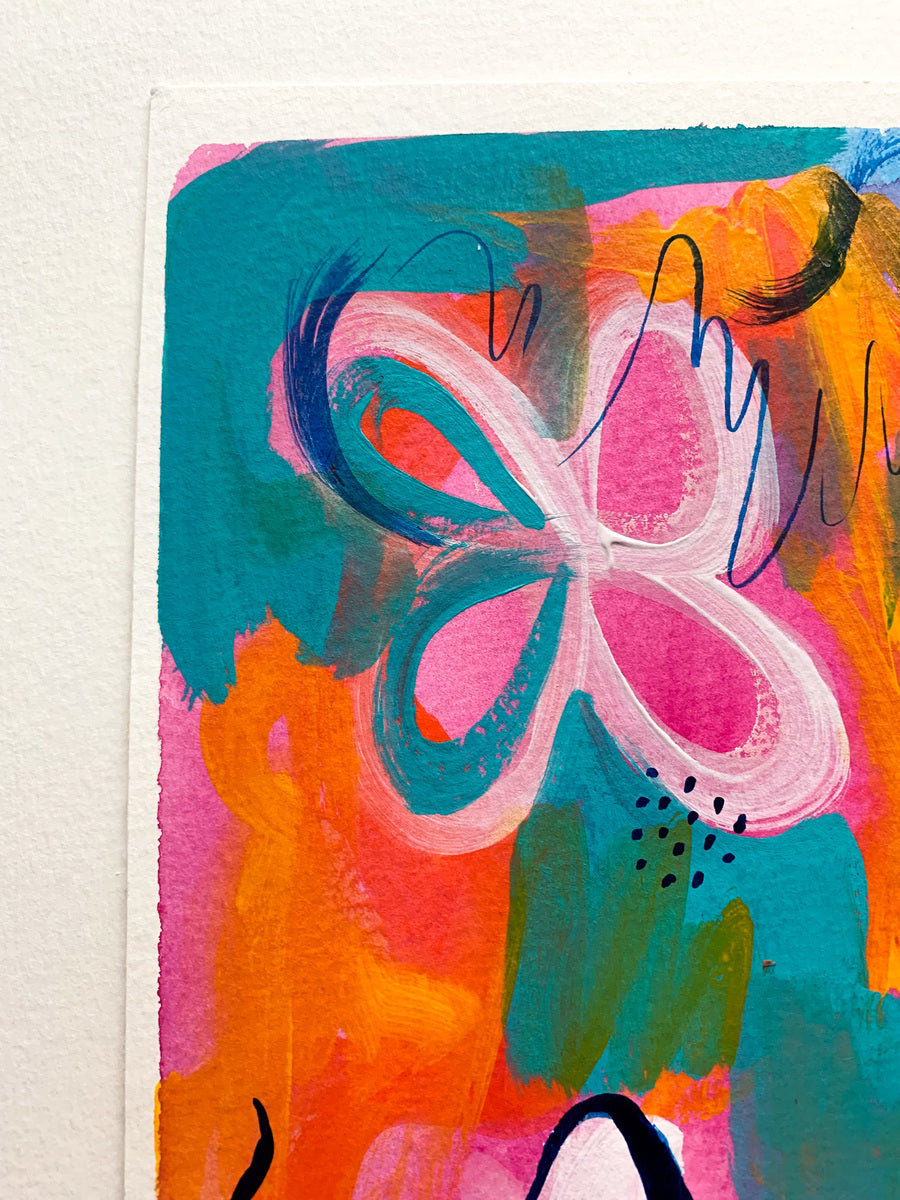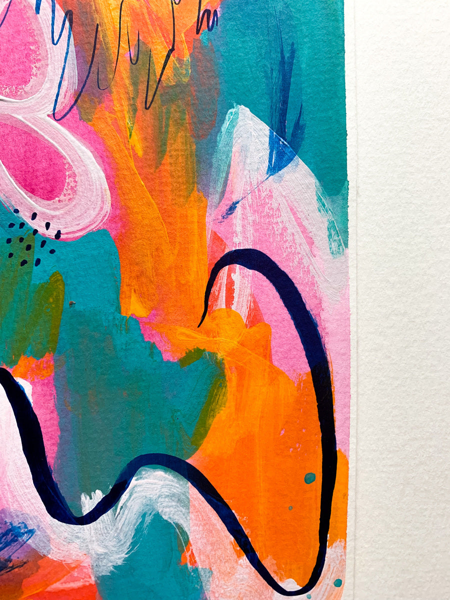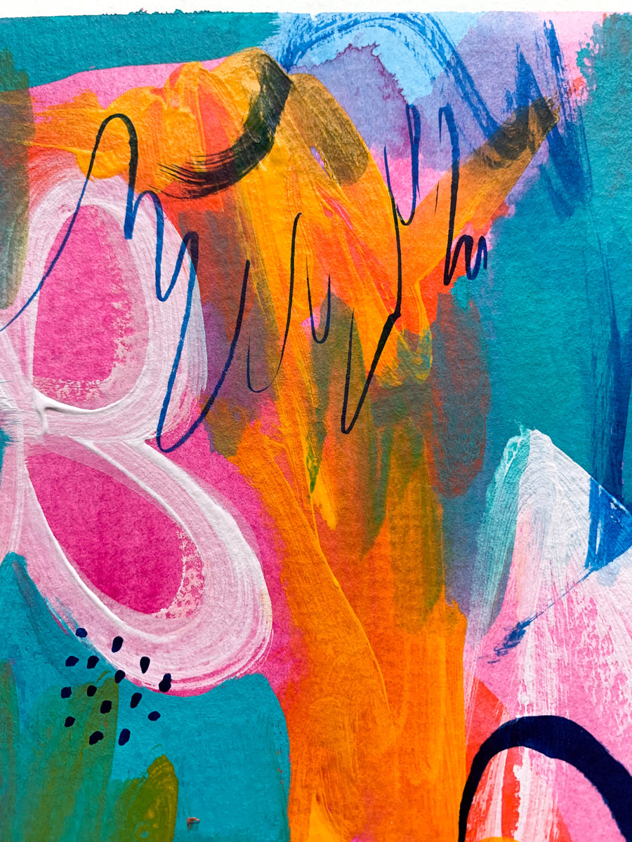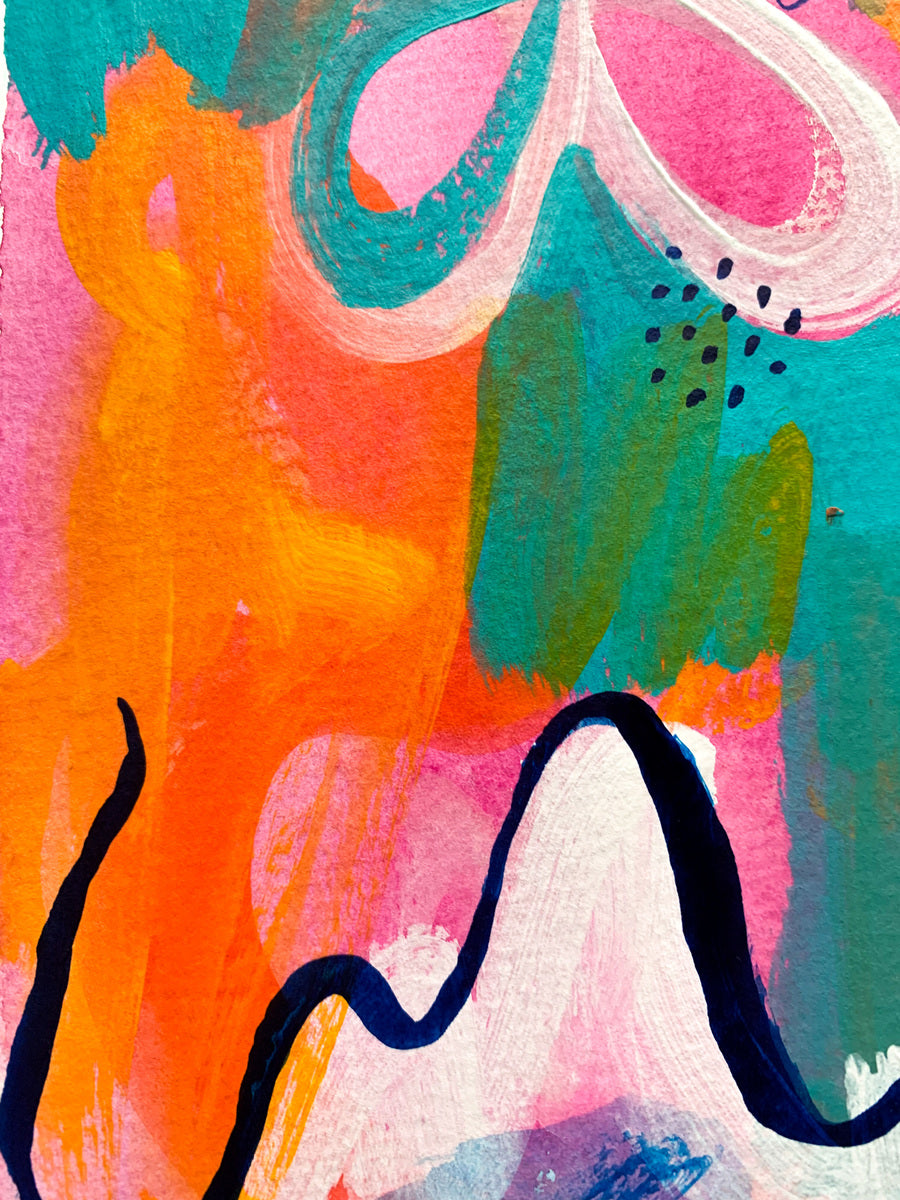 I see dreamy abstract paintings as a place to get truly lost in; to be fully emerged in a sea of radiant colours and flowing patterns and yummy textures. My aesthetic is often nonrepresentational, which allows for the viewer to feel exactly how they want to feel when connecting with the piece. I gain my inspiration from various places; from colour palettes to pebbles, from beautiful forms and shapes, about my feelings, womanhood and spiritual connections. The art works I make are created to bring bursts of energy and to communicate in a way that is the opposite of linear and straightforward. I am a colour obsessive, environmentally conscience, travel-bugged, snack consumer who celebrates all of lives joys.
