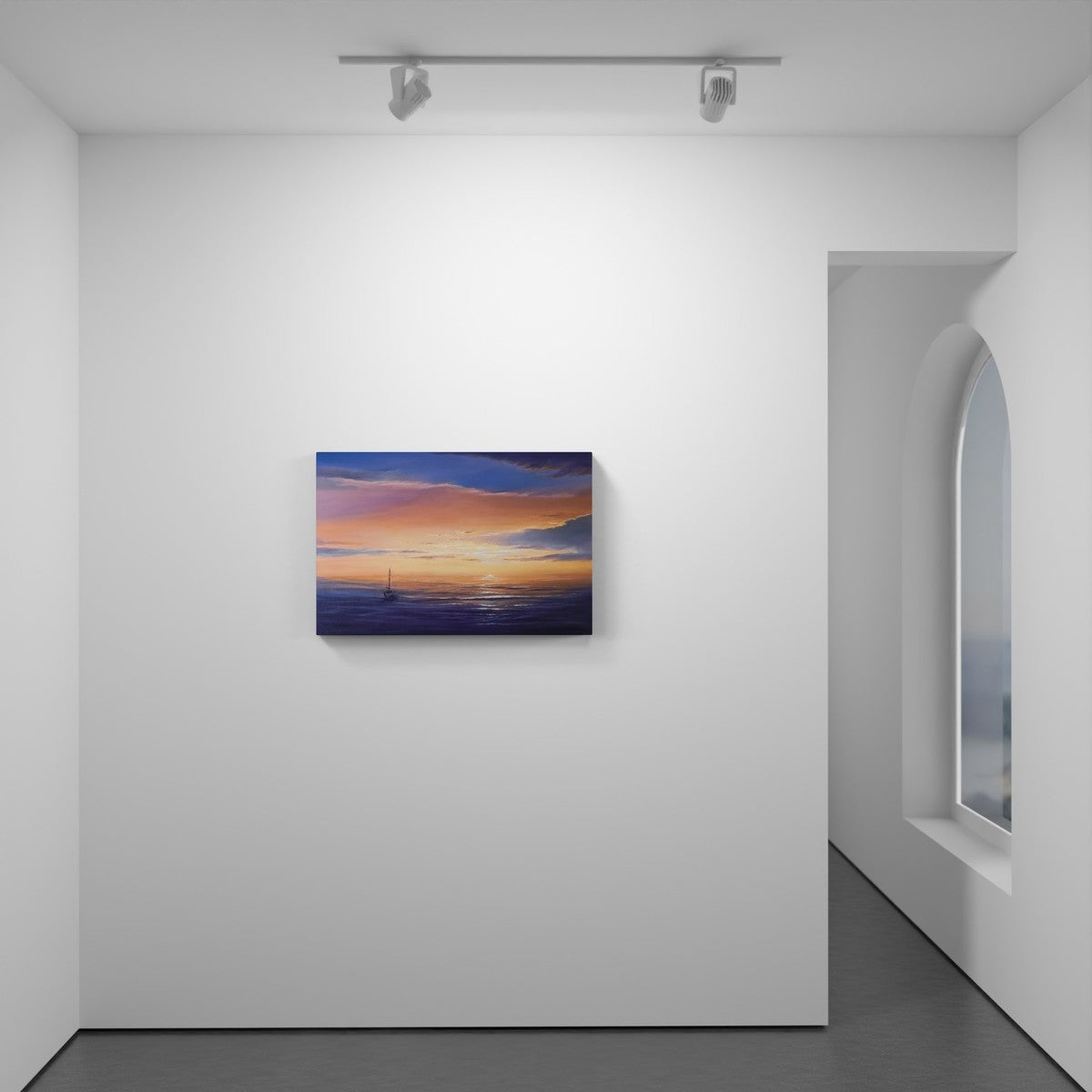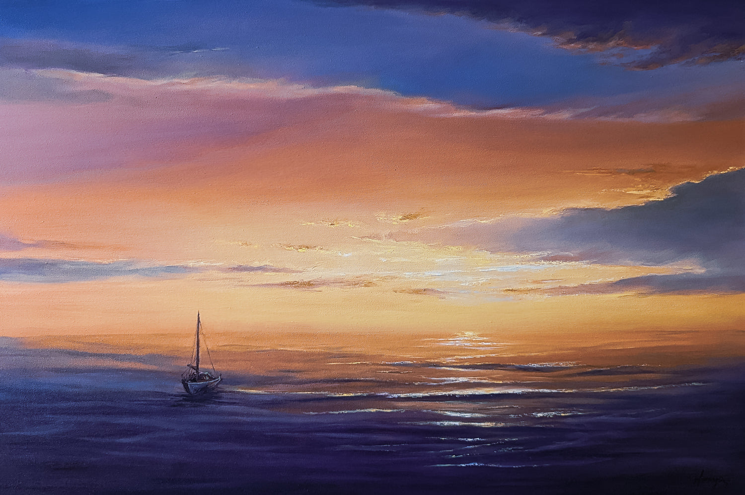 Inspiration taken from the latest visit to Cornwall. With the sun low in the sky, its rays are diffused and warm, casting long, raking shadows across the landscape. The light adds relief, highlights, texture and better conveys depth. This period of time is called Golden Hour, which has been my muse for this painting.