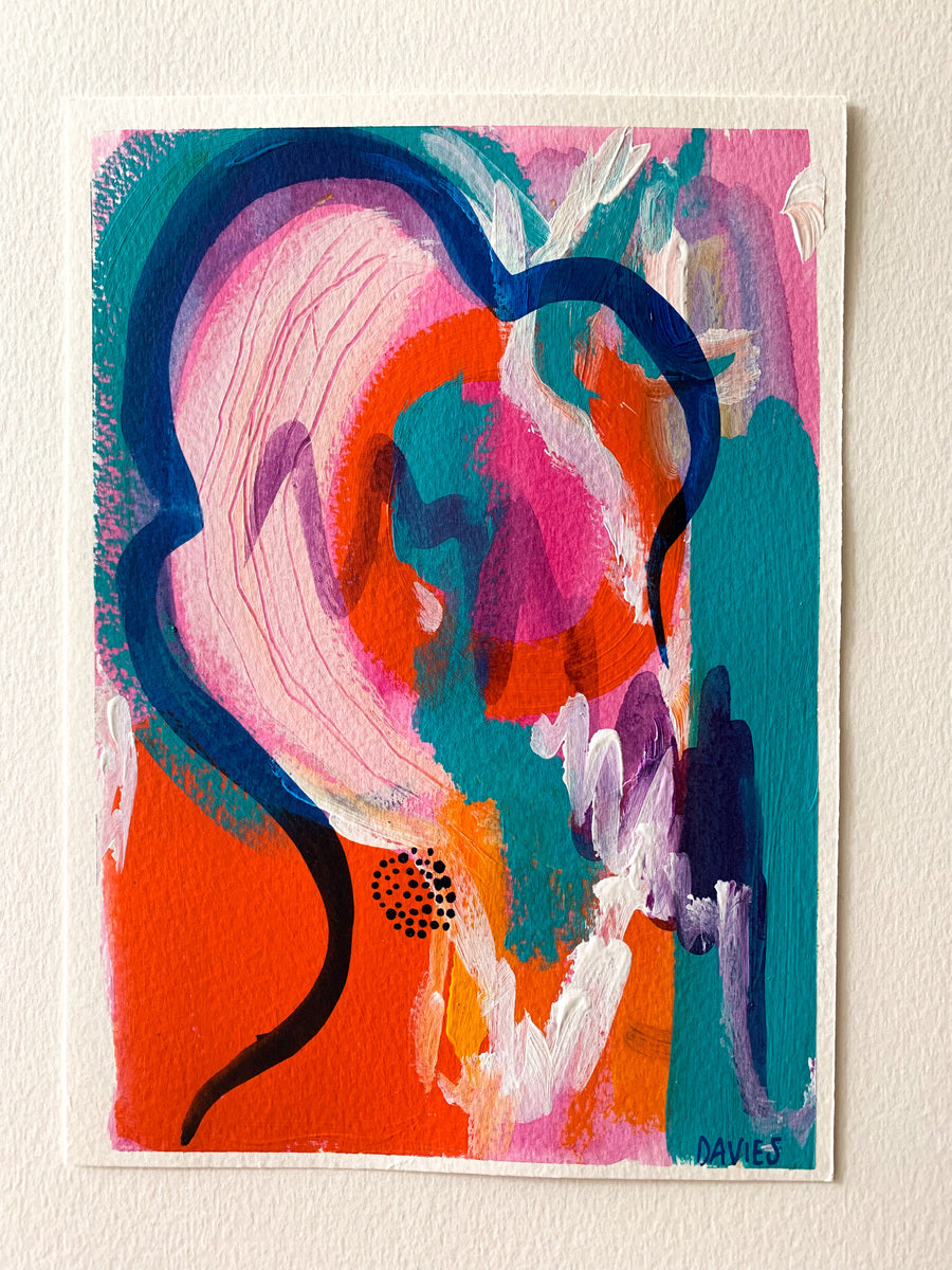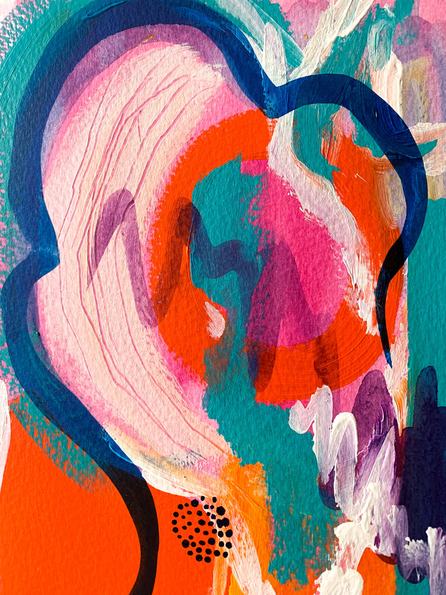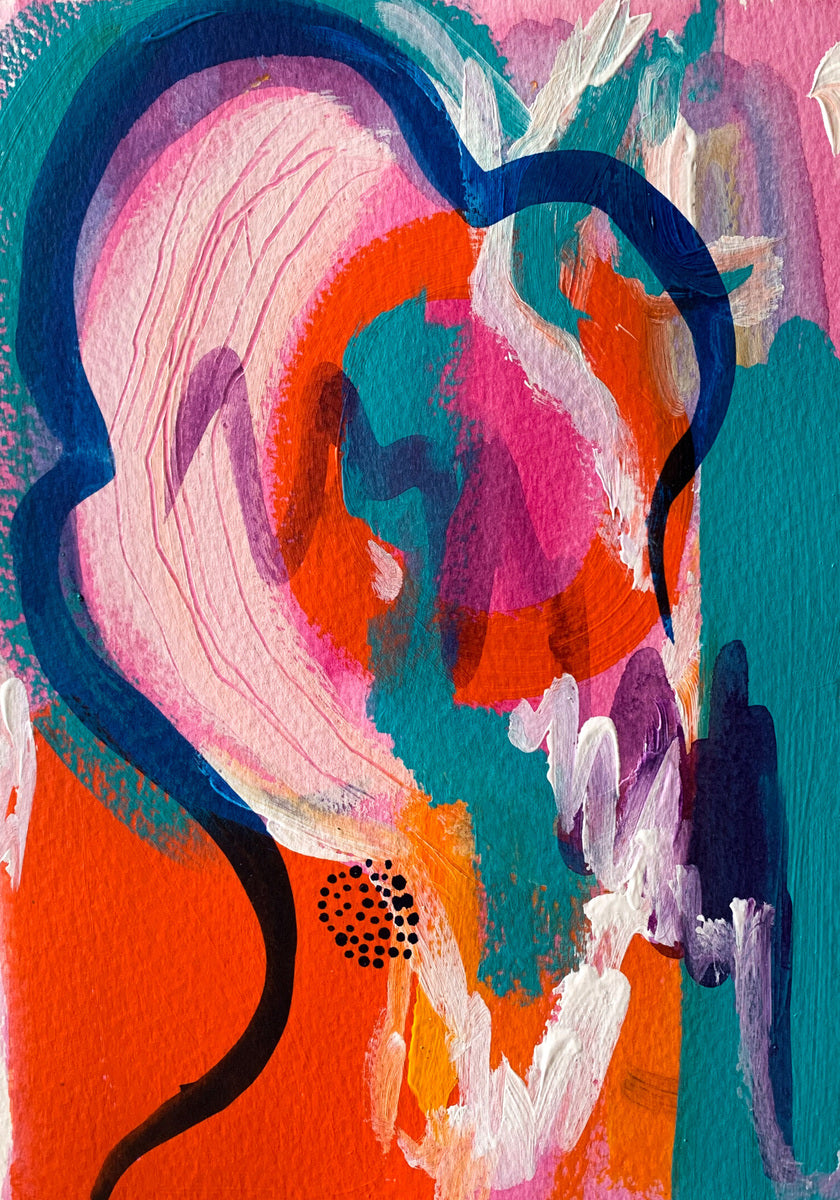 I see dreamy abstract paintings as a place to get truly lost in; to be fully emerged in a sea of radiant colours and flowing patterns and yummy textures. My aesthetic is often nonrepresentational, which allows for the viewer to feel exactly how they want to feel when connecting with the piece. I gain my inspiration from various places; from colour palettes to pebbles, from beautiful forms and shapes, about my feelings, womanhood and spiritual connections. The art works I make are created to bring bursts of energy and to communicate in a way that is the opposite of linear and straightforward. I am a colour obsessive, environmentally conscience, travel-bugged, snack consumer who celebrates all of lives joys.