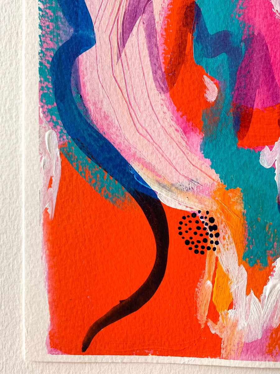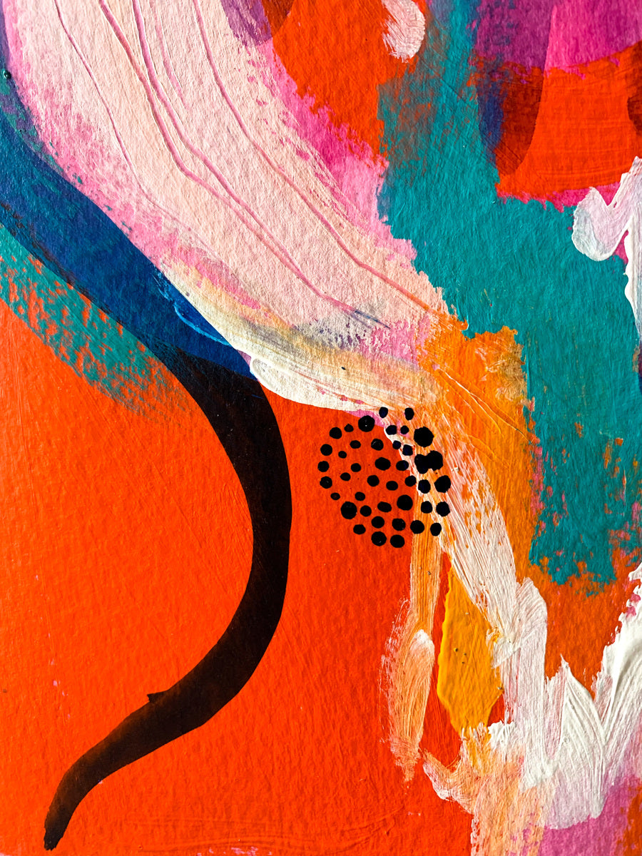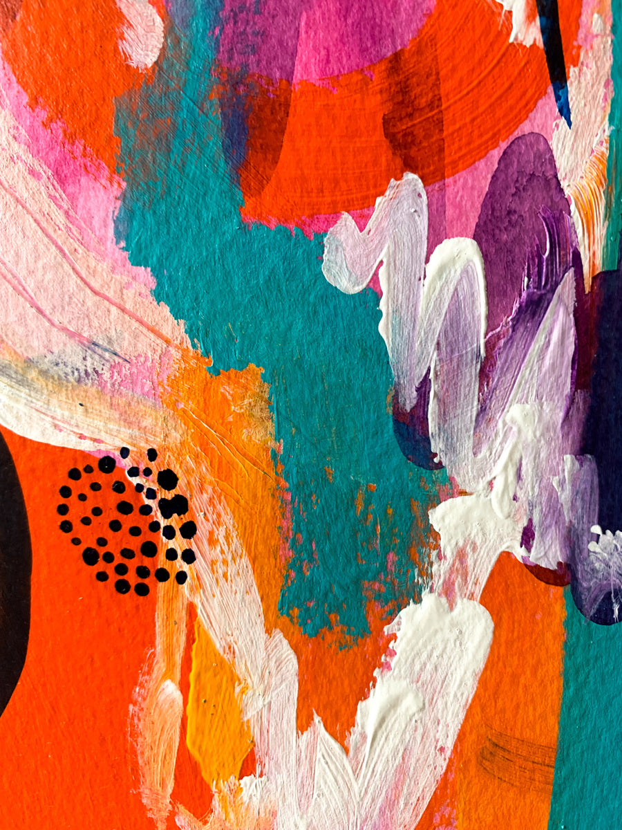 I see dreamy abstract paintings as a place to get truly lost in; to be fully emerged in a sea of radiant colours and flowing patterns and yummy textures. My aesthetic is often nonrepresentational, which allows for the viewer to feel exactly how they want to feel when connecting with the piece. I gain my inspiration from various places; from colour palettes to pebbles, from beautiful forms and shapes, about my feelings, womanhood and spiritual connections. The art works I make are created to bring bursts of energy and to communicate in a way that is the opposite of linear and straightforward. I am a colour obsessive, environmentally conscience, travel-bugged, snack consumer who celebrates all of lives joys.