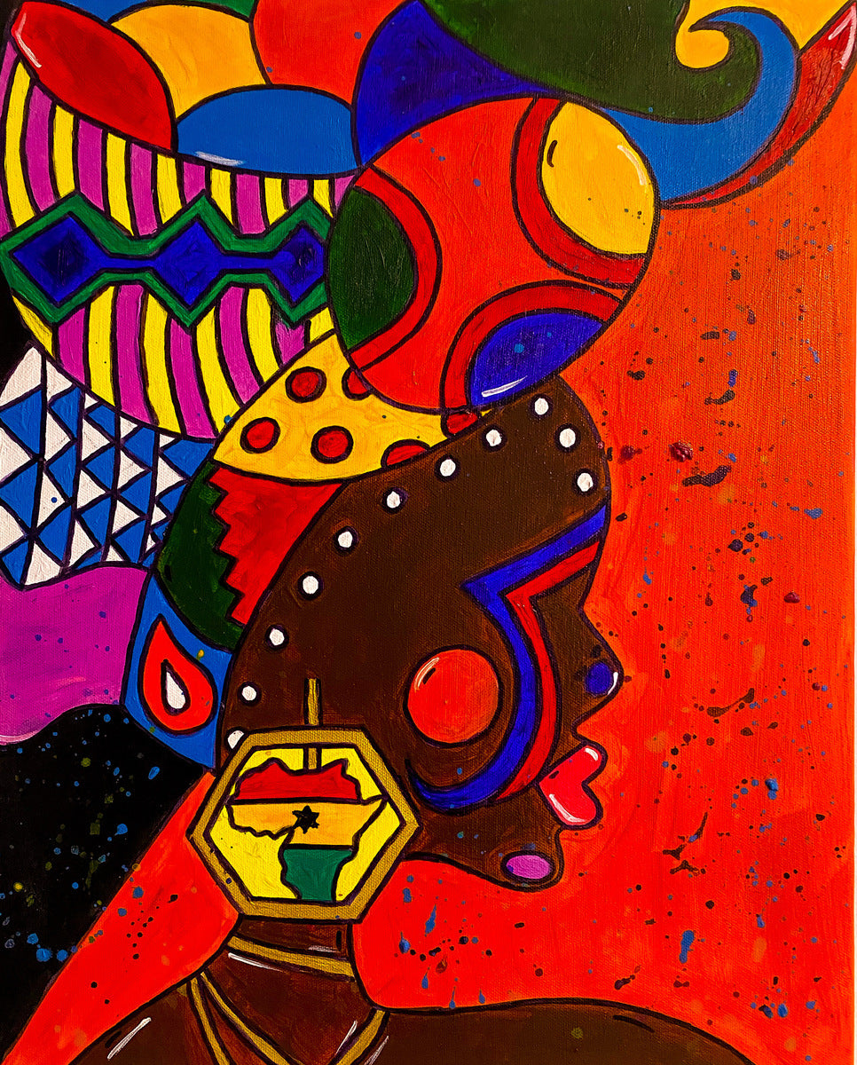 Natalie Adjoa Nana is a contemporary abstract artist who lives and works in London. Natalie was born in 1995 in Ghana located in west Africa. Her bold, colourful paintings of black women represent the blend of motherhood and African culture. Her unique style of painting shows the beauty of love, motherhood and beauty of black women.