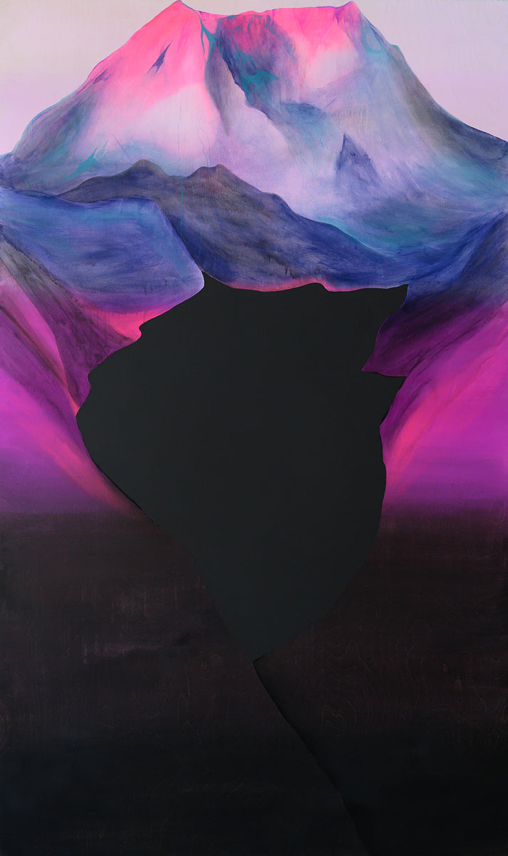 I grew up in the shadow of Mt. Hood in Oregon. It is a fond immovable fixture in the backdrop of my childhood and an image I have come to cling to in an effort to combat personal grief and resuscitate memories of my parents and upbringing. My work explores this personal connection to the Pacific Northwest peaks and landscape and uses it as a symbol of nostalgia, fear, and the reverence I hold for it. My paintings unfold somewhat intuitively; They begin with a specific collaged composition but will allow media and palette to dictate their final outcome. I often strip the landscape of some obvious characteristics leaving behind both familiar terrain and invented space. I deploy strong swaths of black with a contrast of colorful neons in an effort to convey a tension that mirrors both my admiration and anxiety for the locations I pull inspiration from.