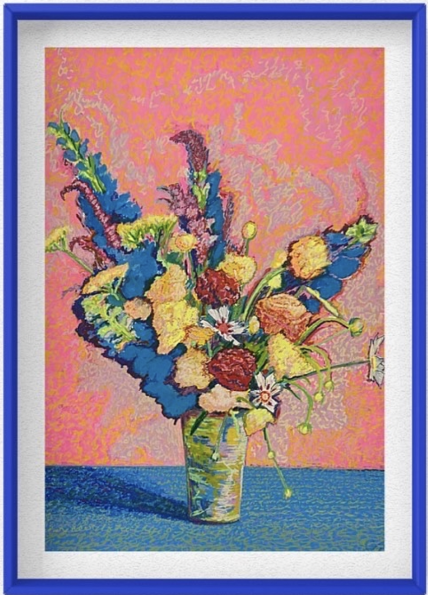 This is a floral painting/ drawing created in 2022. The artwork is created with acrylic markers on 300 lbs of hot-press watercolor paper and framed in a blue wooden frame under museum glass.