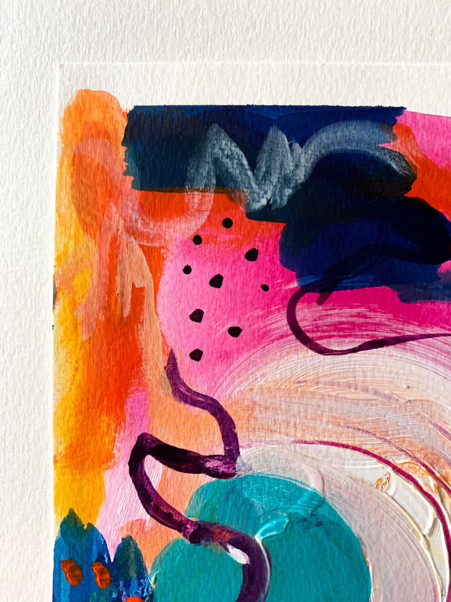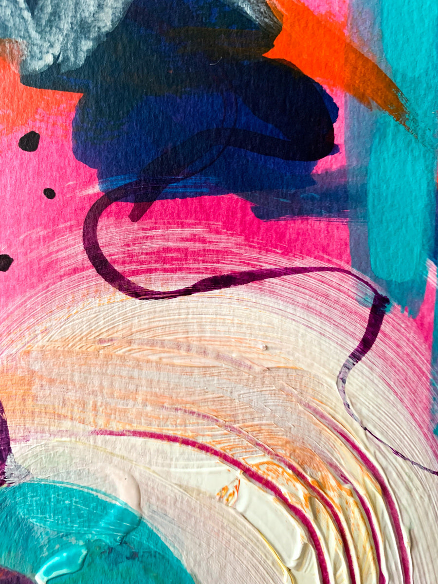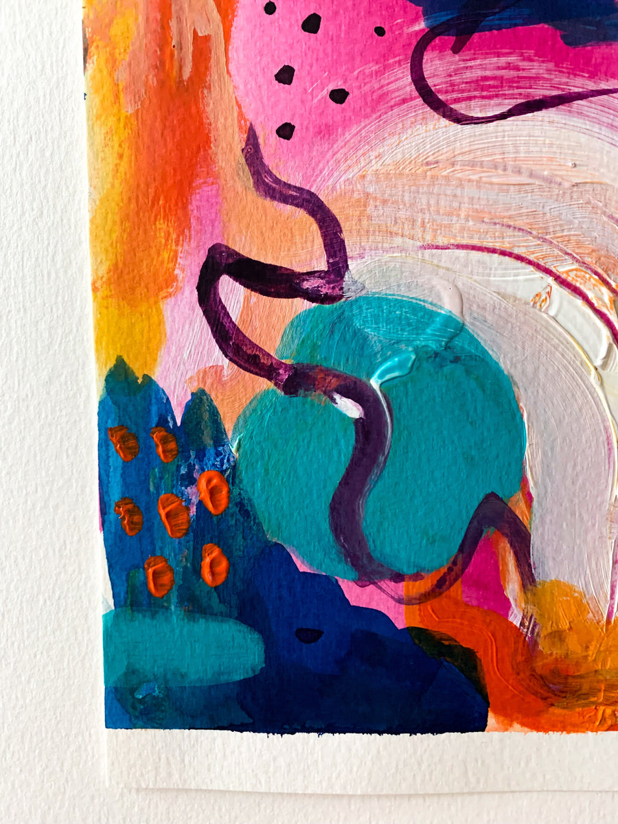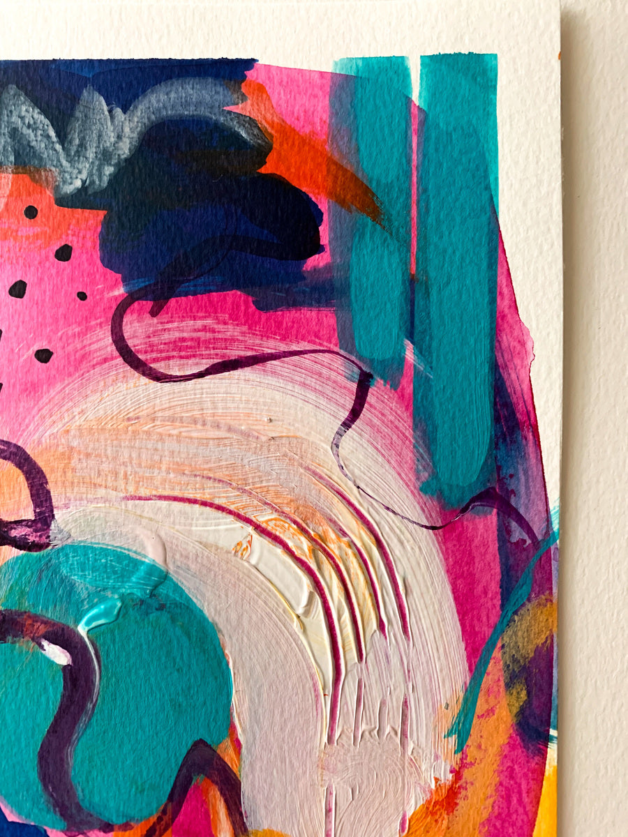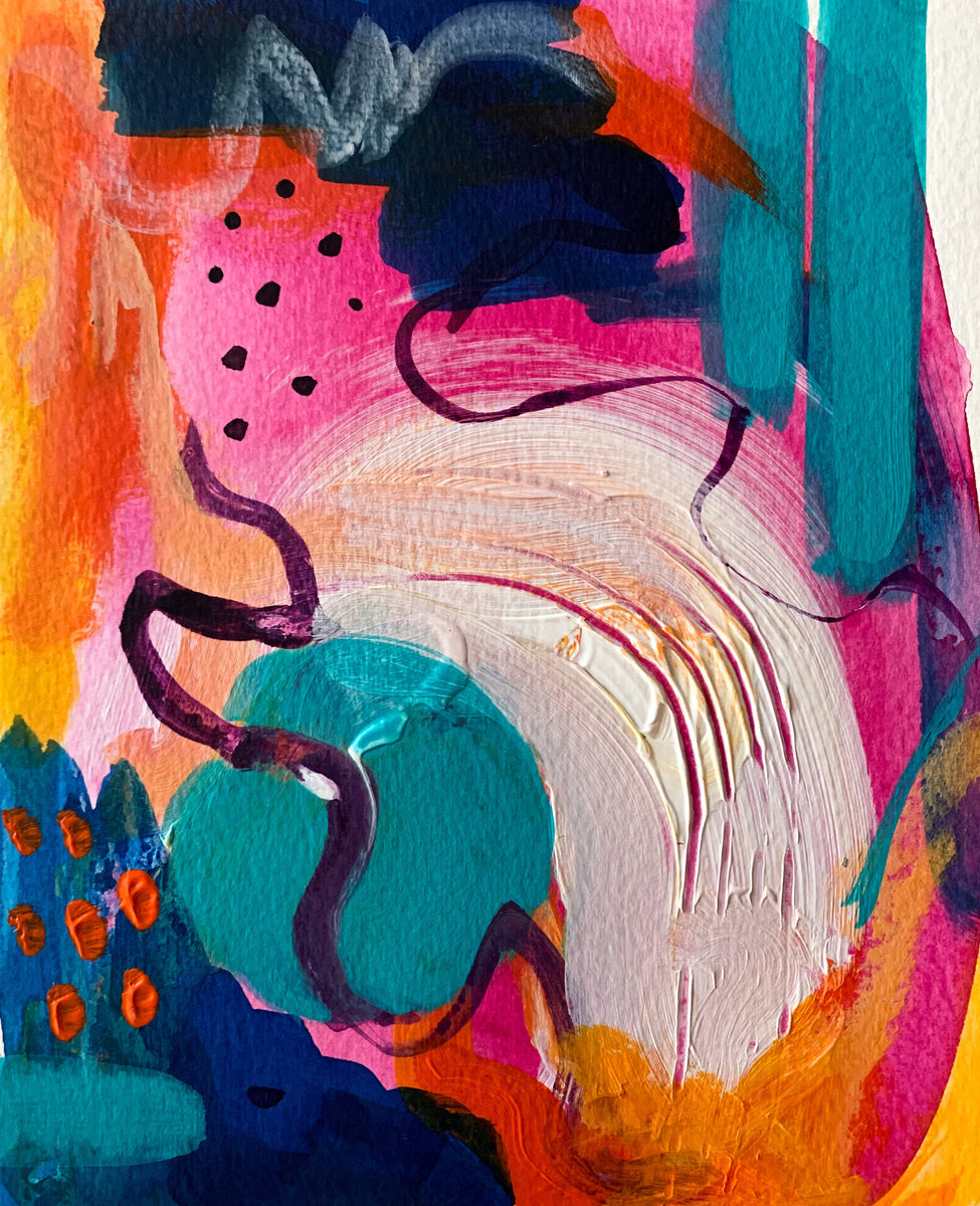 I see dreamy abstract paintings as a place to get truly lost in; to be fully emerged in a sea of radiant colours and flowing patterns and yummy textures. My aesthetic is often nonrepresentational, which allows for the viewer to feel exactly how they want to feel when connecting with the piece. I gain my inspiration from various places; from colour palettes to pebbles, from beautiful forms and shapes, about my feelings, womanhood and spiritual connections. The art works I make are created to bring bursts of energy and to communicate in a way that is the opposite of linear and straightforward. I am a colour obsessive, environmentally conscience, travel-bugged, snack consumer who celebrates all of lives joys.