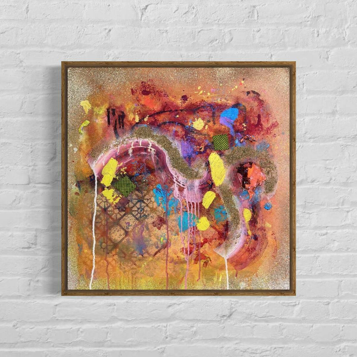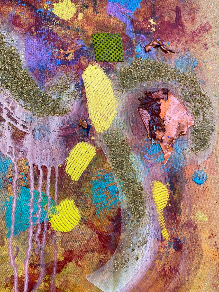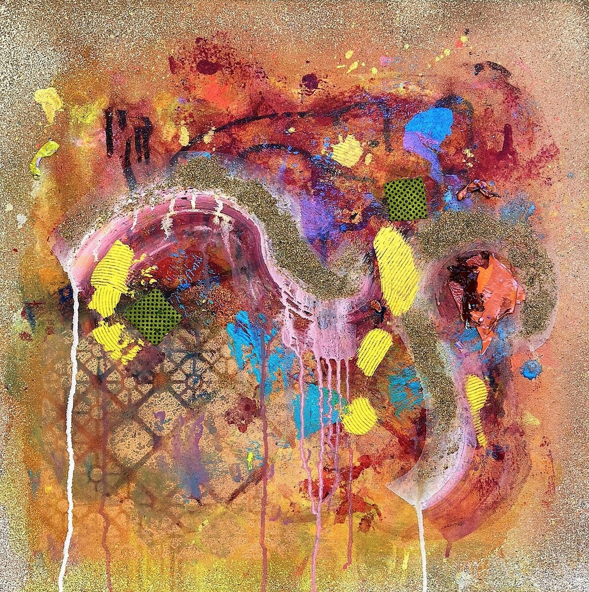 Acrylic, paint chips, deconstructed garden glove, metal flakes and stucco on canvas 24x24 inches (60.96x60.96 CM) on gallery wrapped canvas. Signature on front. No frame, wired and ready to hang.