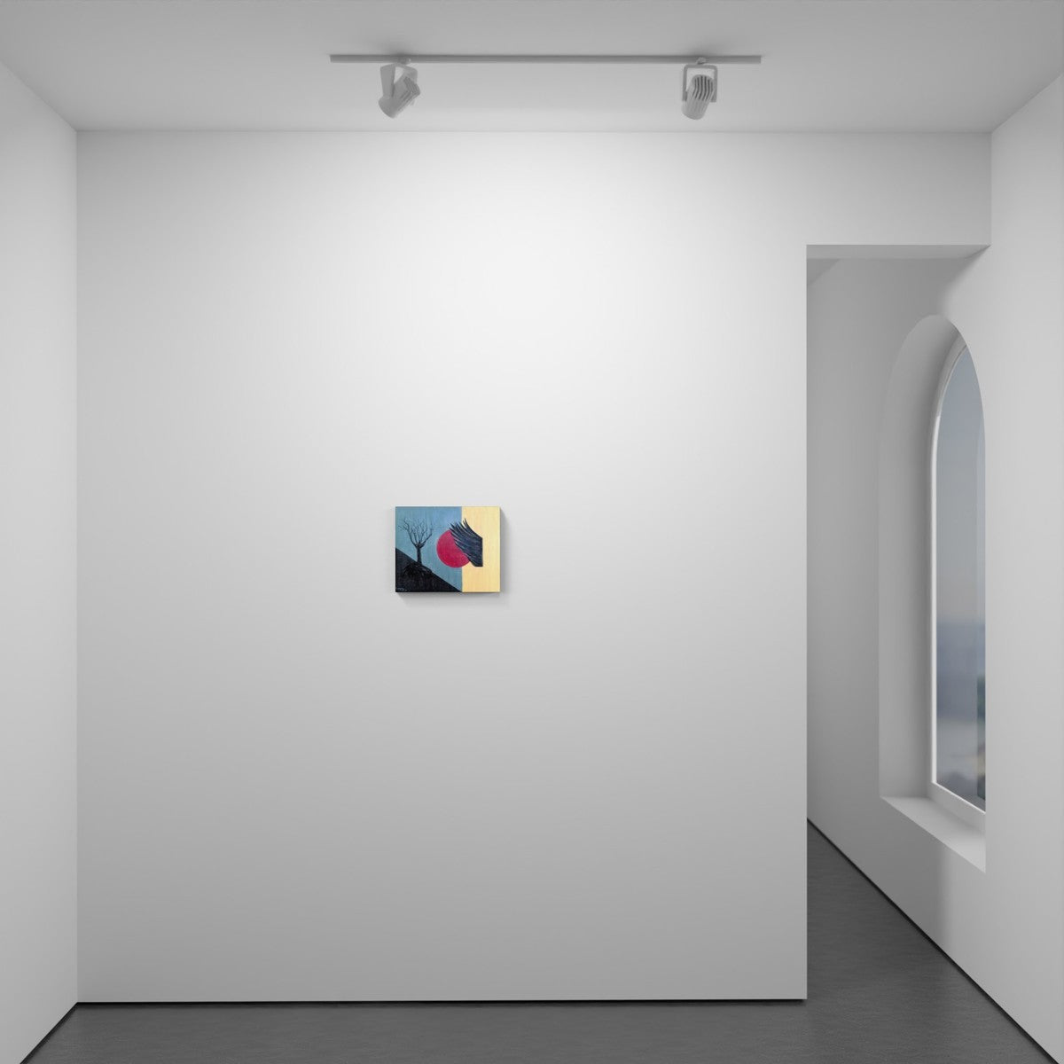 Color-blocked painting showing a bare branch tree, a red orb and black crow wing.