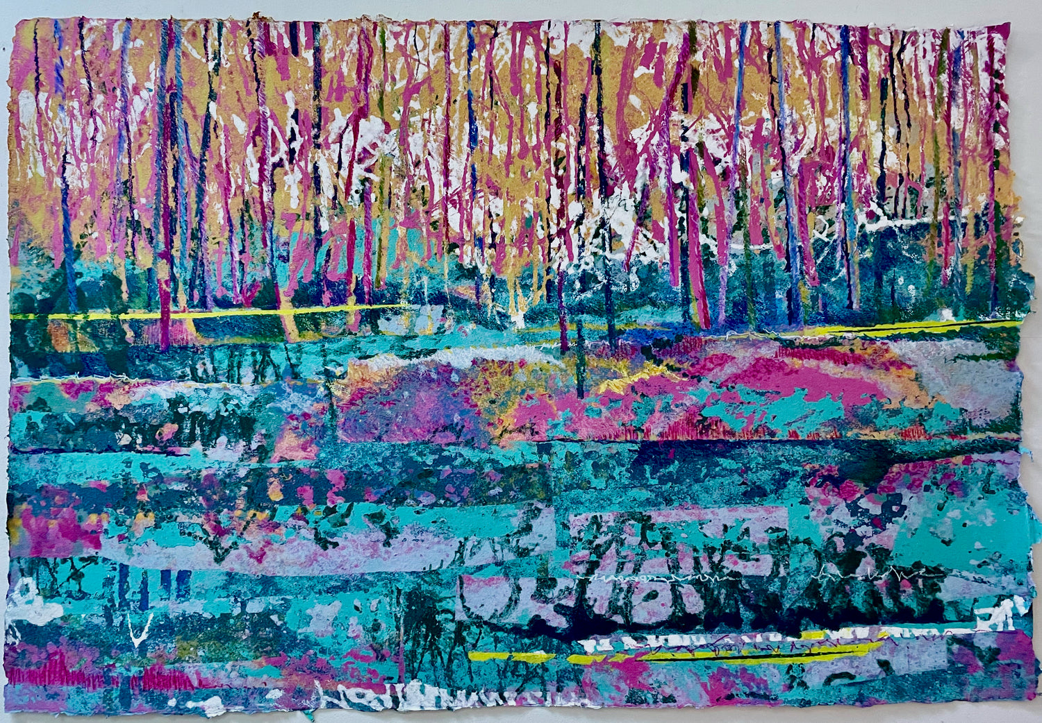 I work on more than one image at a time, moving from one to another, layering different stencils, shapes, and colors, while maintaining the same thought process. Paper pulp painting is spontaneous, I work wet on wet; I am actively engaged in the process. My entire body moves, from mixing pigments in paper pulp, to cutting stencils, to making marks or writing words with syringes and turkey basters with the gestural movement of my arm. The mental and physical energy it takes to think, move, and react to the images that are emerging is what makes this process so exciting and invigorating.