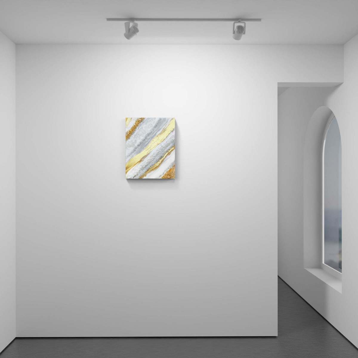 20"x 24", 1.5" depth. Gold paint, gold mica, acrylic paint, crushed glass, mirror glass, and resin on wood panel.