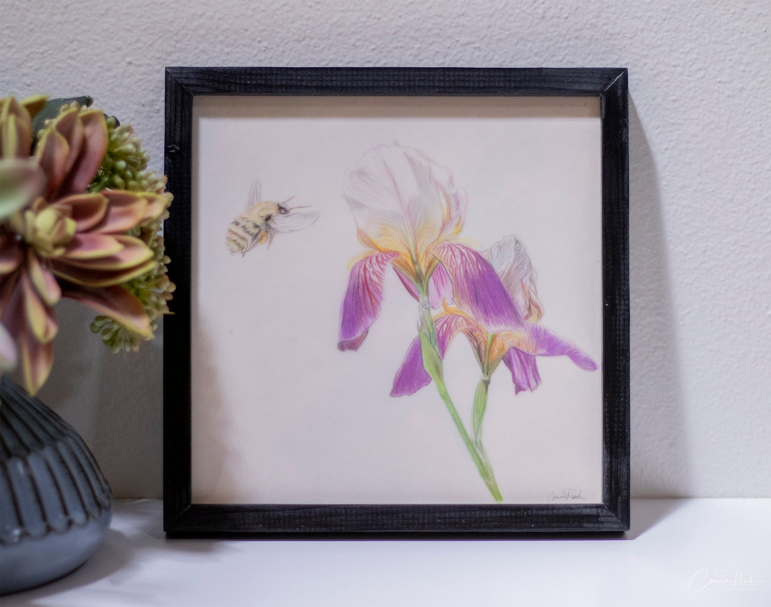 A second in a series inspired by Spring, featuring a bee approaching a flower. These delicate illustrations are hand drawn using colored pencil on drafting film - a translucent synthetic medium which imbues a dreamy quality to the art; yet is still archival. Resting behind the drafting film is a creamy off white background with hints of grey. Original framed piece is signed by the artist and includes a certificate of authenticity, as well as UV resistant plexiglass (Acrylite OP-3) to protect the art over a lifetime. Original is an 8x8” piece in a hand crafted dark pine wood frame.