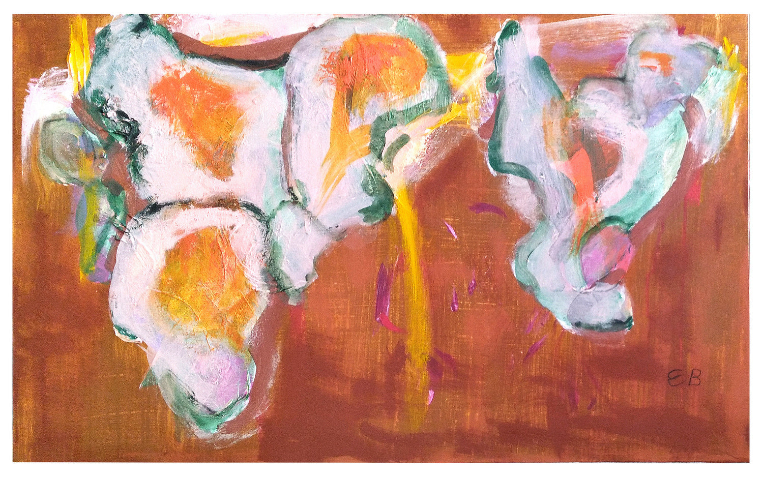 Acrylic on Canvas, earth tones, greens, orange and pink