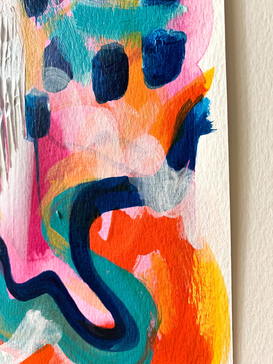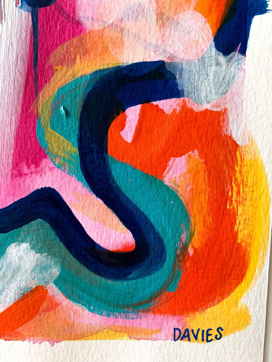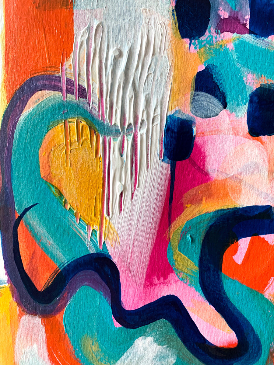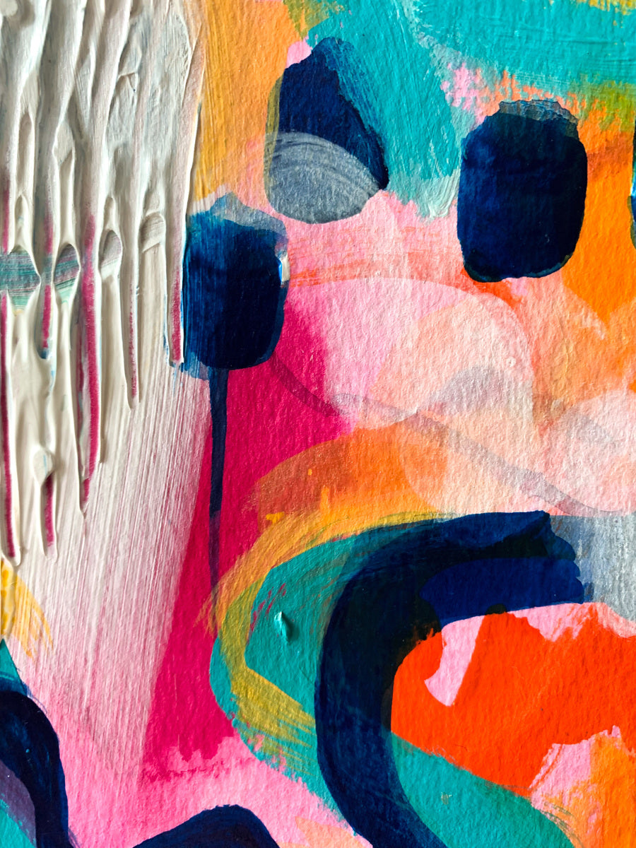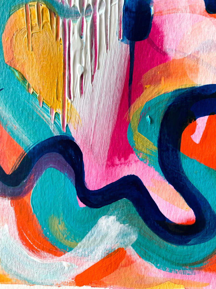 I see dreamy abstract paintings as a place to get truly lost in; to be fully emerged in a sea of radiant colours and flowing patterns and yummy textures. My aesthetic is often nonrepresentational, which allows for the viewer to feel exactly how they want to feel when connecting with the piece. I gain my inspiration from various places; from colour palettes to pebbles, from beautiful forms and shapes, about my feelings, womanhood and spiritual connections. The art works I make are created to bring bursts of energy and to communicate in a way that is the opposite of linear and straightforward. I am a colour obsessive, environmentally conscience, travel-bugged, snack consumer who celebrates all of lives joys.