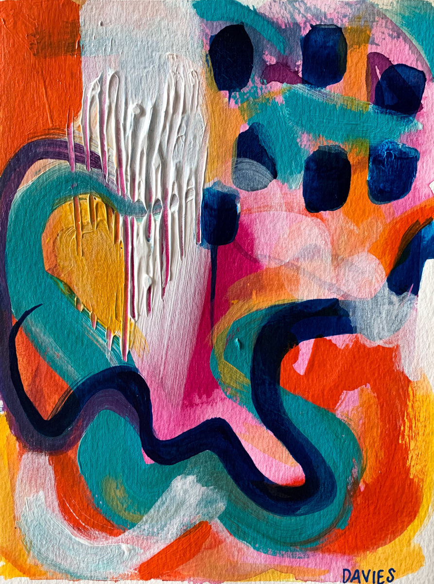 Jo Davies is an Australian mixed media artist living in East London. She would describe her paintings as dreamy abstracts that are designed to bring positive energy to the viewer. Davies has a BA/Btch majoring in Visual Arts and is a full-time secondary art teacher in South East London alongside being an all-the- time artist.