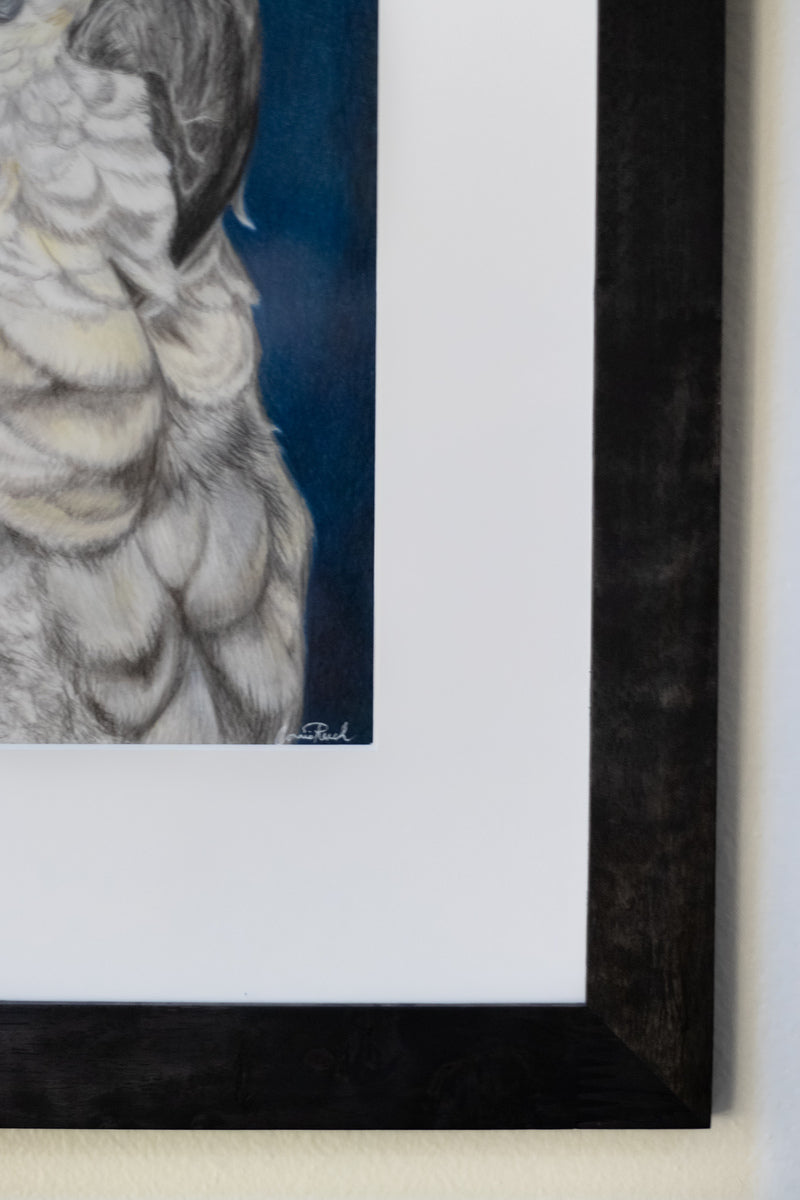The piece is framed in a 18.5” x 22.5” black wood frame, a 16x20 opening with a 2.5” white mat. The glazing is a gallery UV filtering plexiglass (Acrylite OP3) designed to block out at 99.7% of UV light, ensuring lasting protection of the artwork. This plexiglass is a superior substitute to glass - it is lighter, shatterproof, and provides extensive UV protection to prints and original artwork.