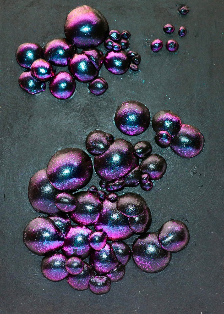 Handmade 3D chrome colourshift bubbles on a black background. Framed in a deep set dark wood frame