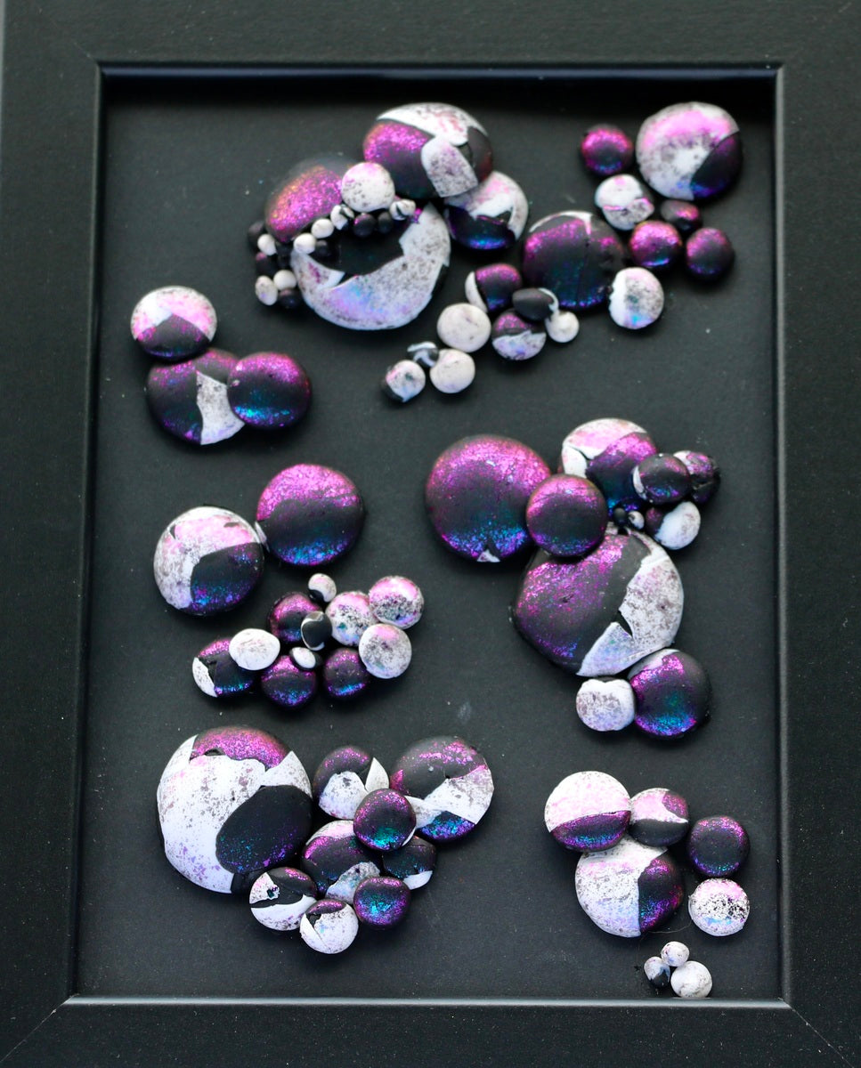 Handmade 3D black and white mixed bubbles with colourshift on a black background. Framed in a black wood frame