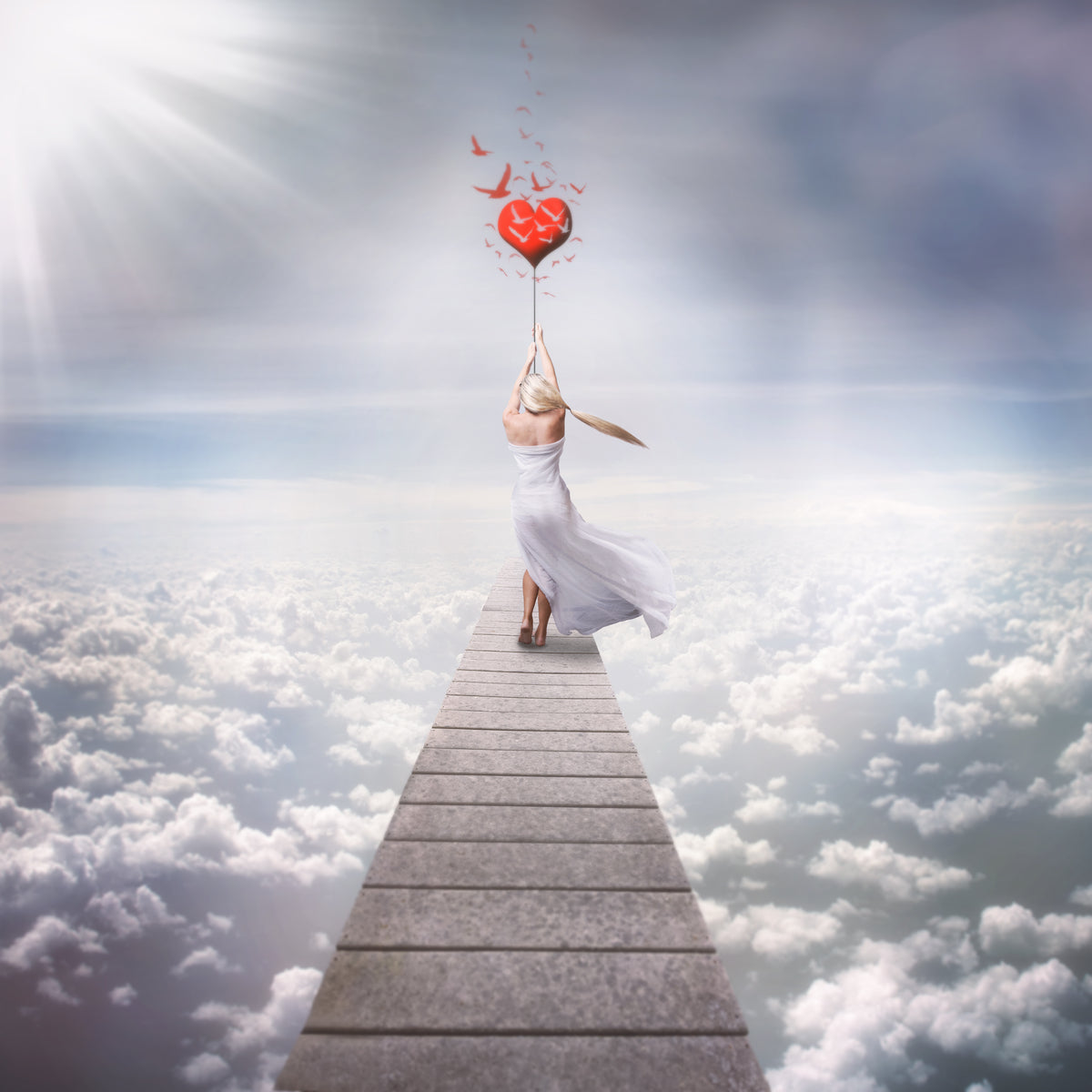 "Walkway" is a visual enchantment, an invitation to traverse the bridge between reality and the surreal, where emotions take flight and dreams find their wings. It encourages viewers to embrace the ephemeral beauty of love and the transformative power of letting go, all set against the backdrop of an endless, azure sky where the heart finds its truest expression.