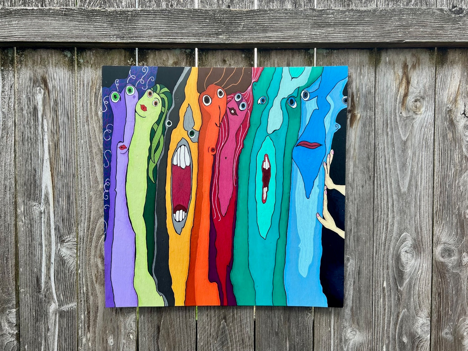 24' x 24' acrylic on wood. Note, this was created using a piece of found wood, there's a slight bow to this piece, the edges hang about 1/4 inch from the wall as seen in one of the pictures.